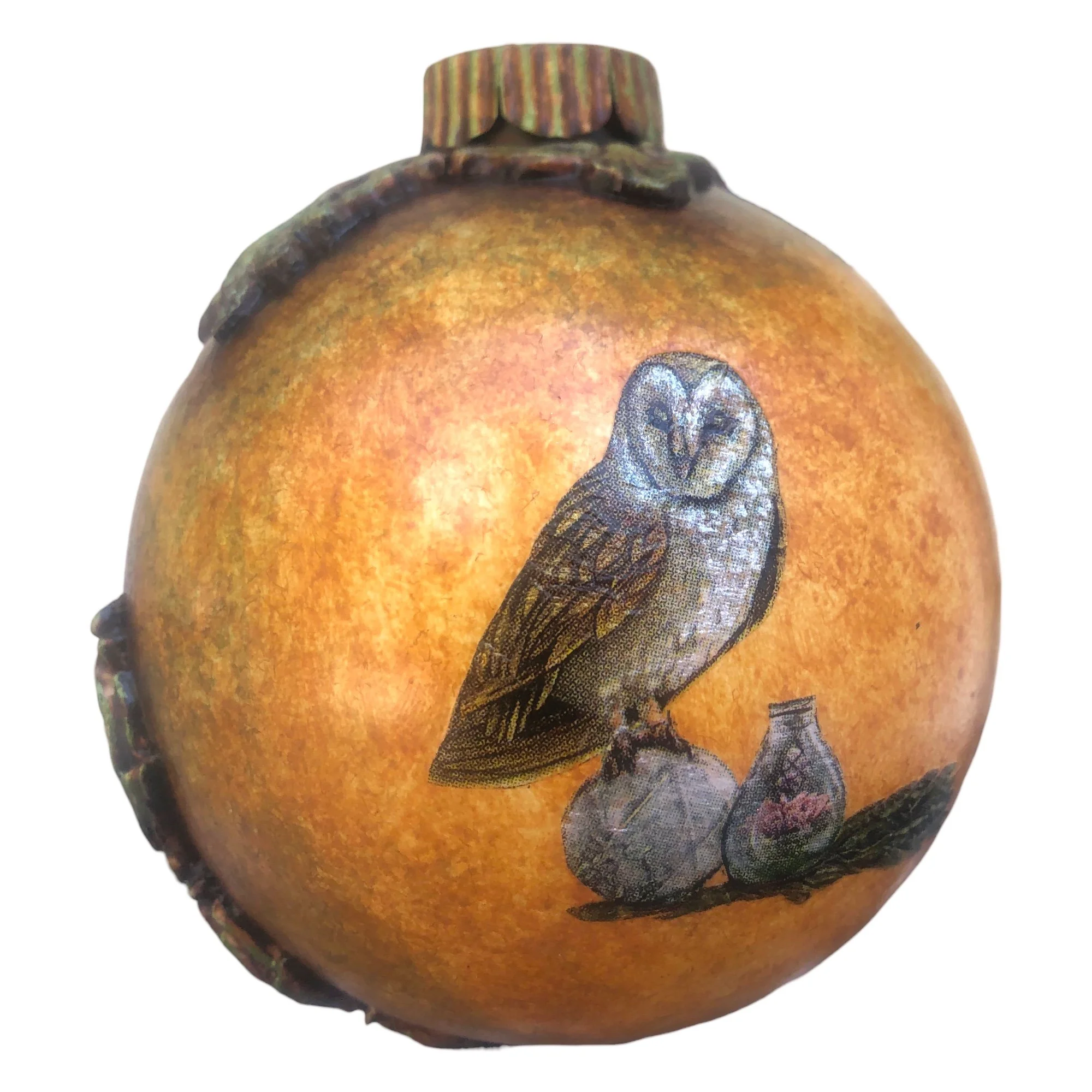 This ornament is for those who like Autumn and cute witch hats! It features a beautiful witch hat on a white pumpkin with an owl on the back. The ornament is vintage style painted with browns, yellow, orange and a hint of green. The leaf molding, framing it is highlighted with metallic green and gold. These ornaments are for year round display and make fantastic unique gifts!